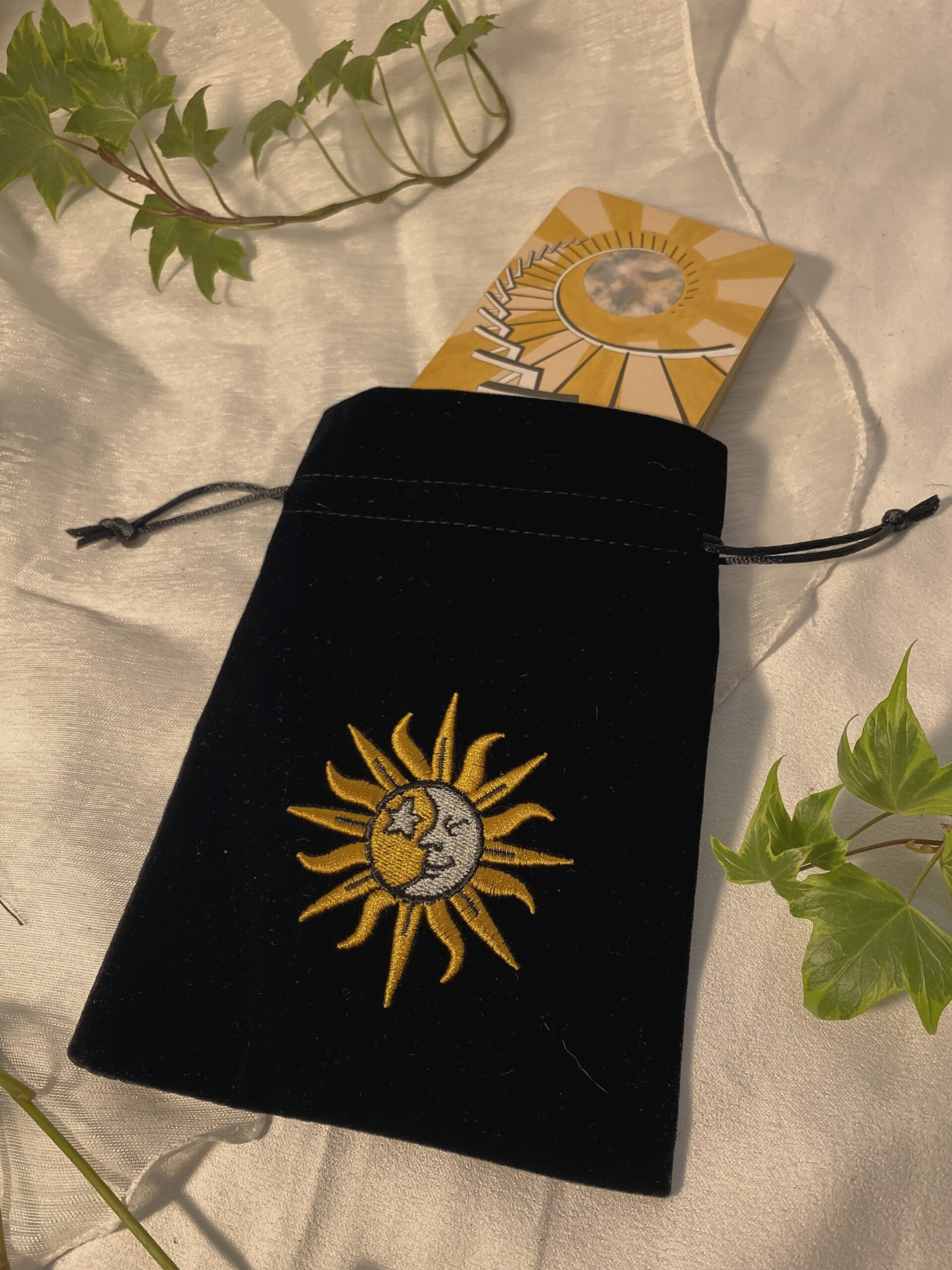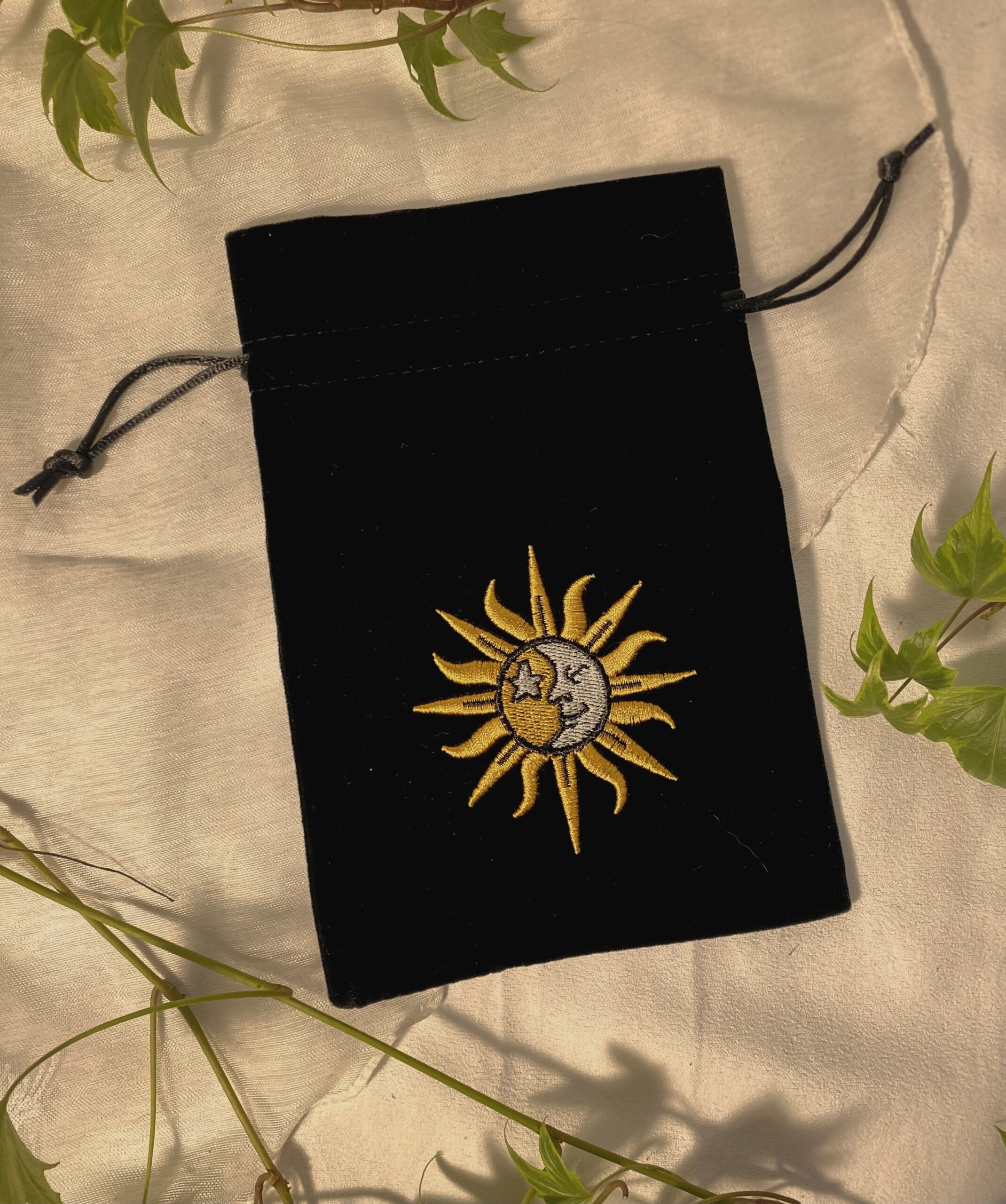 Préservez vos outils divinatoires et objets précieux avec magie grâce à ce magnifique pochon en velours noir, orné d’une broderie délicate représentant la lune et le soleil. Confectionné dans un velours doux et épais, ce pochon offre une protection optimale à vos cartes de tarot, oracles, cristaux, runes, bijoux et autres trésors.